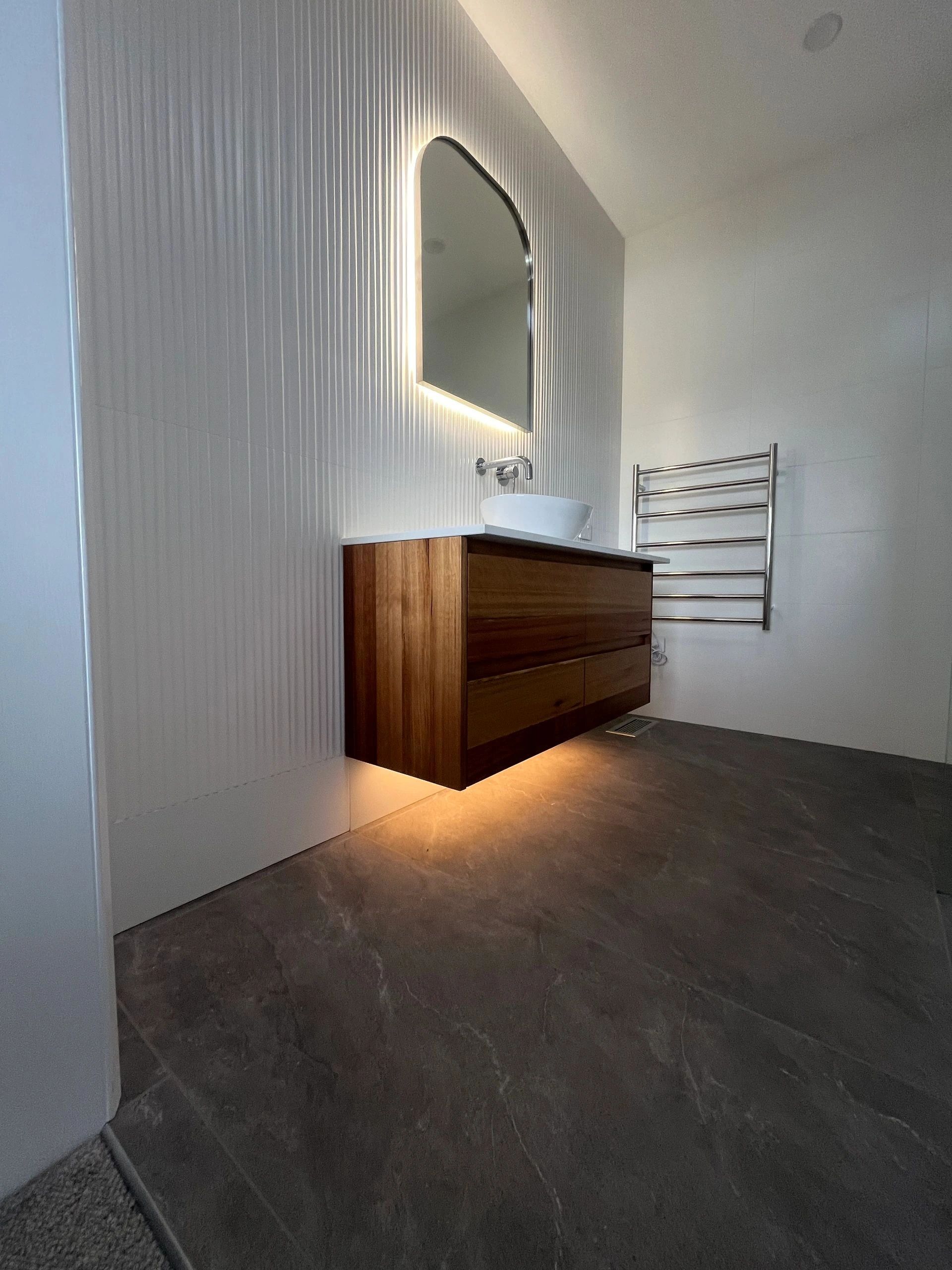 We excel in creating functional, stylish bathrooms tailored to your needs. Our expertise includes modern large tiles, feature walls, and walk-in showers with tiled linear drains, perfect for Southern Tasmania’s homes. Whether you’re in Hobart seeking a sleek, modern bathroom or in Huon Valley wanting a heritage-inspired design, we use high-quality materials to ensure durability and beauty. Our renovations enhance your home’s value and comfort, designed to withstand Tasmania’s unique climate.